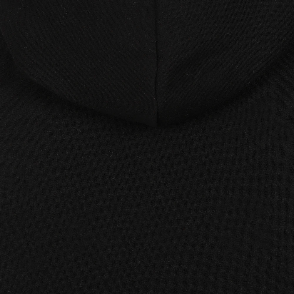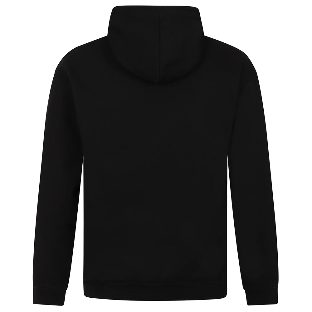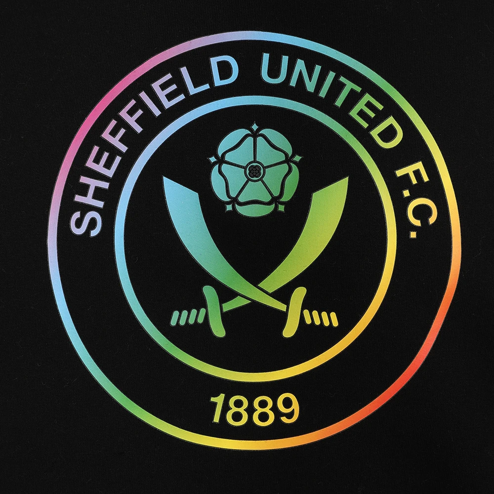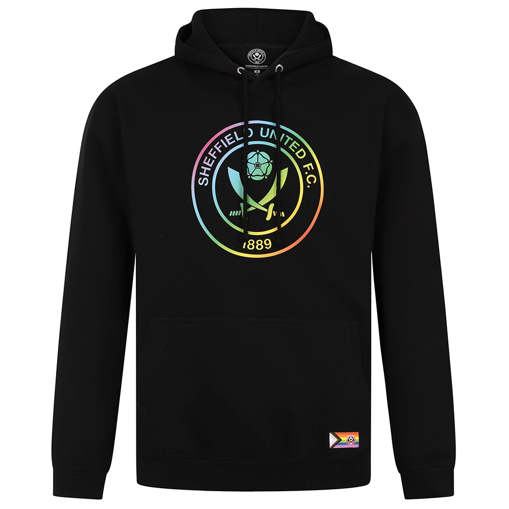 - Rainbow hoody in black featuring rainbow crest and progress flag hem detail.